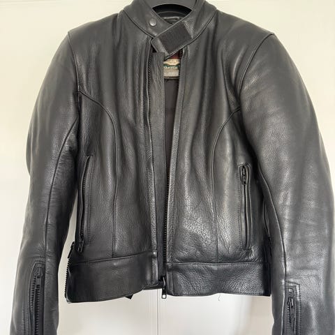 Svart, FXRG Harley-Davidson MC-skinnjacka i stl 1W (ung 46) i nyskick. Dragkedja fram, flera vertikala fickor med dragkedja och meshfoder på insidan. Inbyggda skydd för rygg, axlar och armbågar. Mängder av justeringsmöjligheter och öppningar för ventilation. Nypris 6.500 kr