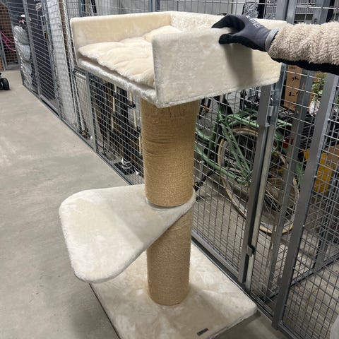 Paket med klösträd, transportbur och mysig kattbädd för katt. Klösträdet har flera nivåer, liten koja och hängande boll att leka med.