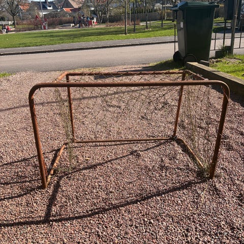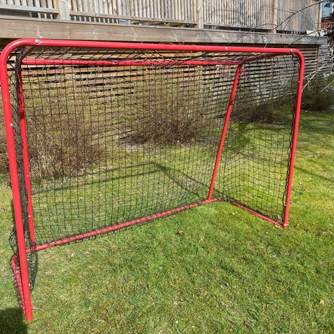 Målbur med röd metallram och svart nät, bra för lek med boll eller puck. Stabil konstruktion som står stadigt på gräsmattan. Minimå ishockeymål