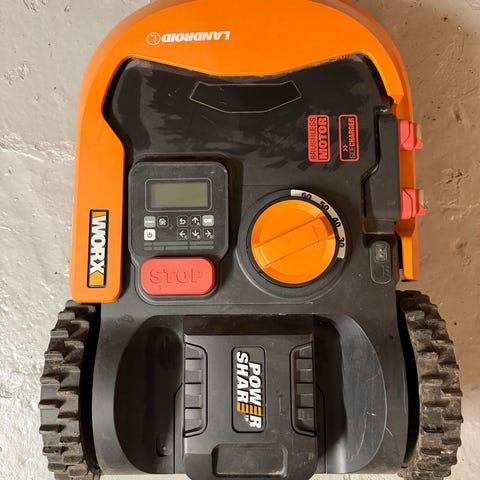 Robotgräsklippare från Worx i orange med stora hjul och tydliga reglage upptill. Med på bilderna syns även ett skyddstak över laddstationen och två enheter bredvid varandra. Jag säljer mina pärlor så de kan hjälpa andra med en fin gräsmatta.