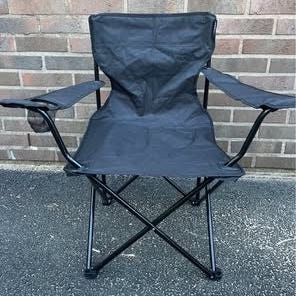 Blå hopfällbar campingstol med armstöd och mugghållare i ena armstödet. Stadigt tygsäte på svart metallstomme som är lätt att fälla ihop och ta med.