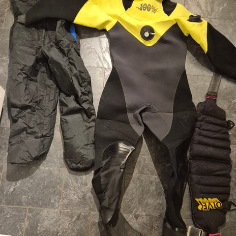 En rejäl dräkt för dykning i kallare vatten. Observera att dräkten har några år på nacken. Manschetter och dragkedja ser fina ut men tätningar/limningar bör kontrolleras innan användning.