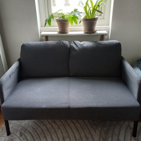 Ikea Linanäs 2-sitssoffa i mörkgrå färg. Sparsamt använd. Väldigt fräsch kondition.