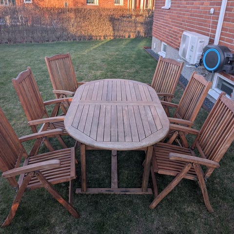 Stadigt matbord i trä med kraftiga svarta metallben. Rektangulär skiva med naturlig kant, passar bra på altan eller inomhus.