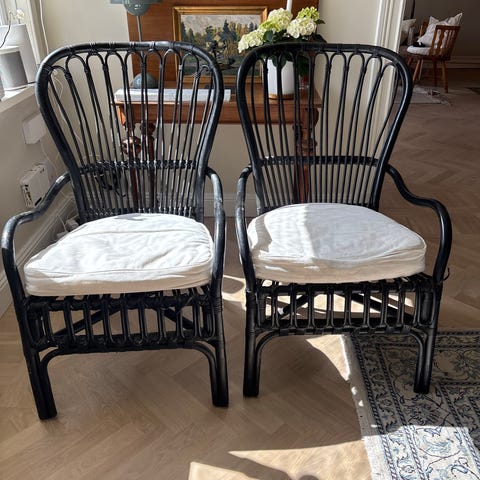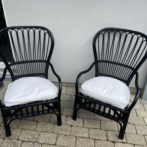 Två svarta rottingfåtöljer från IKEA med vita sittdynor. Sköna att sitta i med hög rygg och armstöd i böjd rotting. Överdraget till dynorna behöver tvättas.