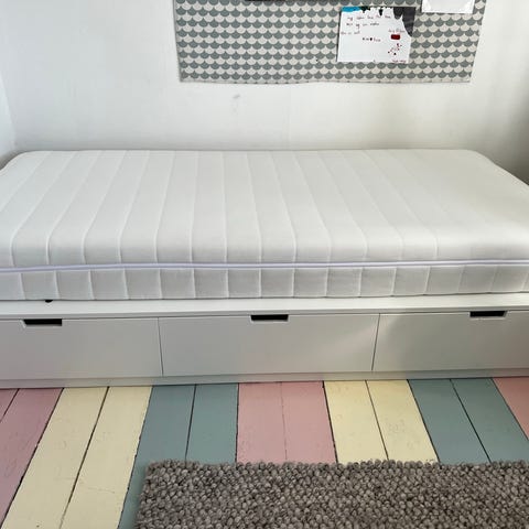 Tustna vit bäddmadrass ovanpå. Nypris 1895kr
