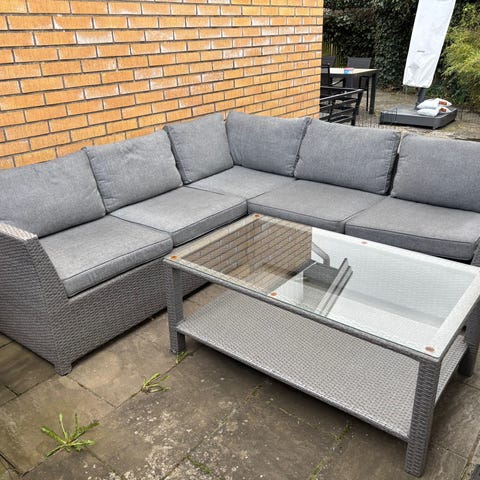 Utehörnsoffa i grå metall med gråa dynor. Hel och fullt fungerande. 2 x 2 m. Två av dynorna har pyttesmå hål, men dessa dynor går att vända så att hålen inte syns. Bord med glasskiva.
