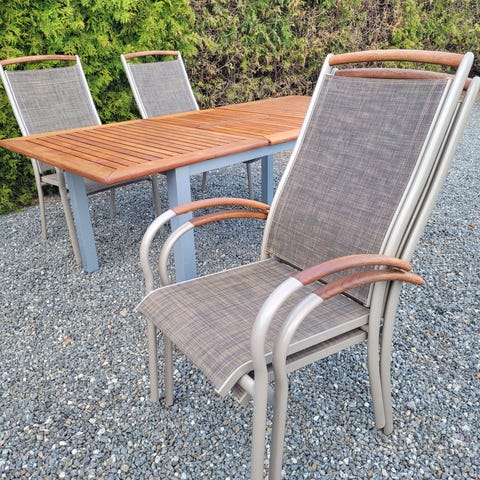 Ett stilrent och praktiskt utdragbart/ förlängningsbart utebord tillsammans med 6 bekväma positionsstolar från Brafab.