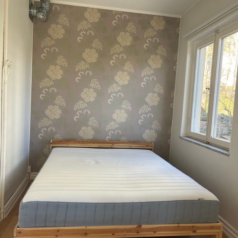 Snygg och fin sängram som säljes pga ommöblering och nytänk. Passar bra ihop med tunn resårbotten. Bild 2 ihopmonterad men utan fin bäddning som på reklambilderna :)