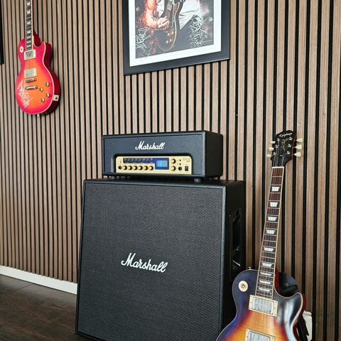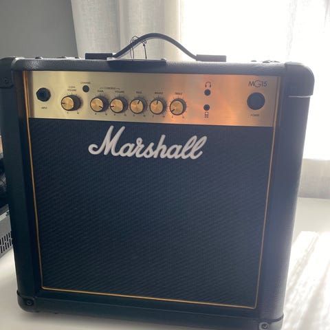 Marshall DSL20 comboförstärkare för elgitarr med flera reglage på frontpanelen. Har in- och utgångar på baksidan för högtalare och andra anslutningar.
