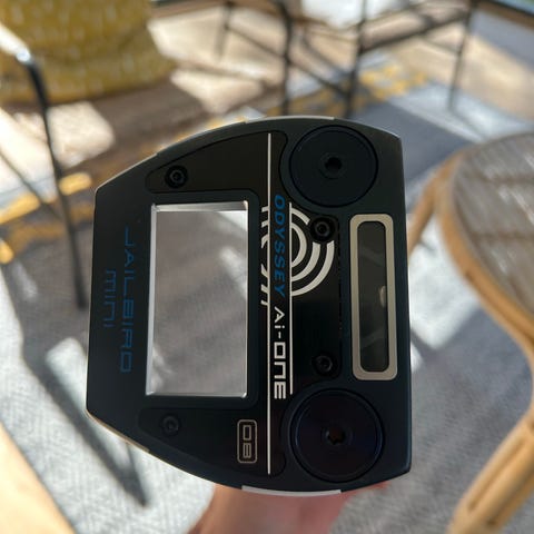 Odyssey Ai-ONE #1 putter, 34 tum, med svart klubbhuvud och vit insert. Skaftet har rött grepp med Odyssey-tryck och tydlig siktslinje på huvudet. Vann den på en tävling i vintras och blir överflödig hos mig.