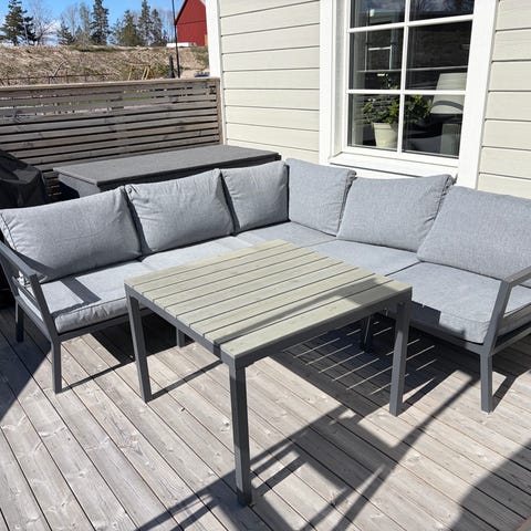 Soffa och fåtölj från Mio i svartlackerad aluminium med beige sitt- och ryggdynor, samt matchande bord med ribbad skiva. Passar bra på balkong eller uteplats och är lätta att möblera om efter behov.