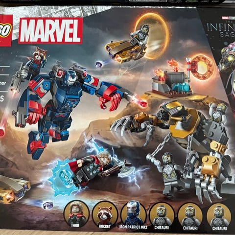 LEGO Marvel Super Heroes Hulkbuster Smash-Up, set 76104 med Iron Man-figur och flera minifigurer. Kartong och manual syns på bilderna tillsammans med klossarna i påse.