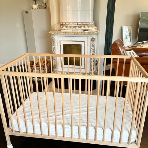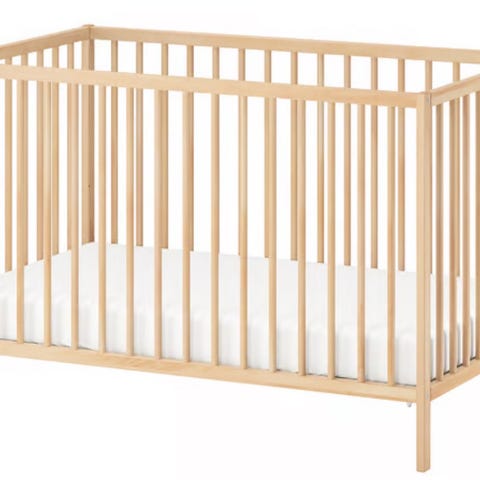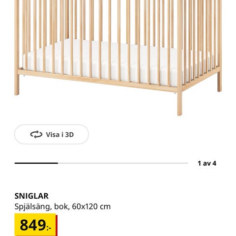 Spjälsäng Sniglar från IKEA i bok. Jättefint skick, i princip oanvänd. Sängbotten går att installera på två olika nivåer. Medföljer gör alla tillbehör: madrass Krummelur, madrasskydd Lenast, fyra stycken dra på-lakan, spjälskydd i linne från Nobodinoz samt mobilhängare. Enda att anmärka på är att vi satt möbeltassar på sidan av sängen, men dessa går såklart att ta bort.