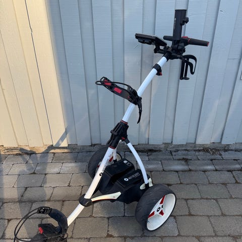 Motocaddy S1 eldriven golfvagn i svart och rött med tre vita hjul och tydlig display på handtaget. Vagnen är justerbar i 9 olika steg för olika hastighet.Har hållare för scorekort, paraply och remmar för att spänna fast golfbagen. Den är enkel att fälla ihop. Det medföljer givetvis ett Lithiumbatteri och originalladdare. Batteriet är underhållsladdat under vinterhalvåret för bättre kondition. Vagnen är mycket lite använda, skulle tro att den inte har rullat mer än tio 18-håls rundor. Den säljs pga sjukdom. Kvitto finns.