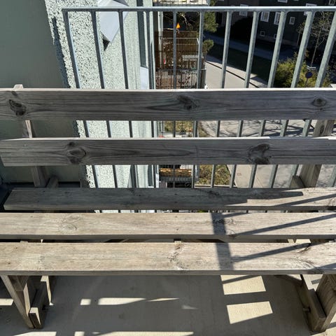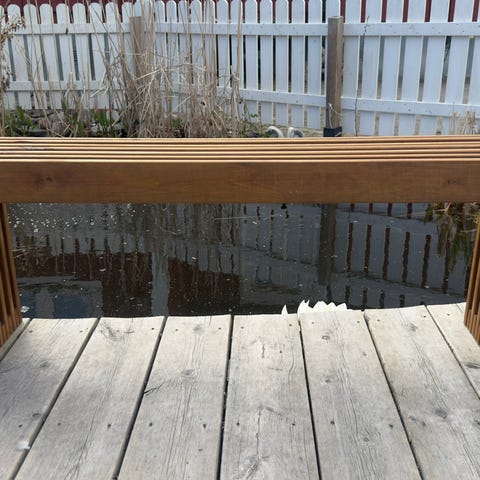 Stadig vinröd bänk med ribbor, tung och stadig sittbänk. Smal modell som passar fint längs en vägg eller på balkongen.