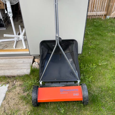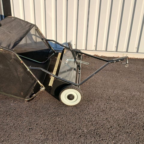 Husqvarna sopborste / uppsamlare som kopplas bakom åkgräsklippare. Har uppsamlarsäck i tyg och dragstång framtill.