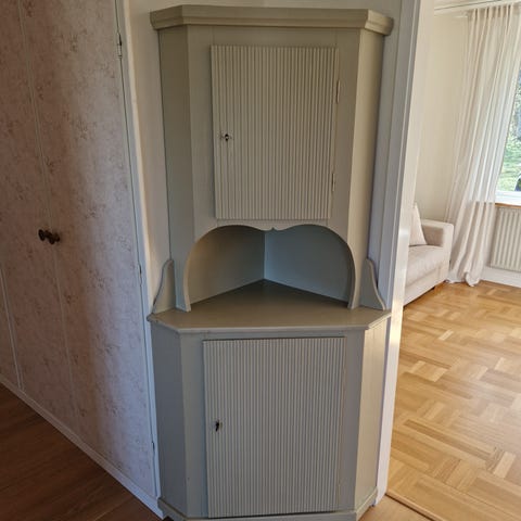 Vit garderob/linneskåp/drängaskåp med enkel dörr och klassisk topp. Har nyckelhål med beslag och gott om plats för förvaring inuti.