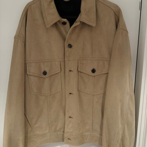 Den beige overshirten är 100% get mocka och storlek 48. Rak passform och passar en M kille.