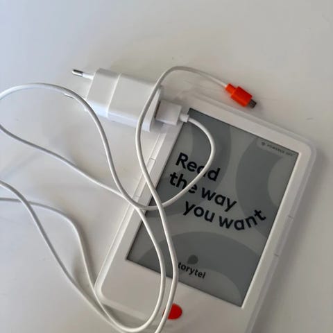 Storytel reader, version 2 (USB-C). Gott skick! Finns en liten repa i skärmen (se bild), syns ej vid läsning (se bild med text). USB-C-kabel ingår, men ej laddare. Uppdaterad med senaste appversion.