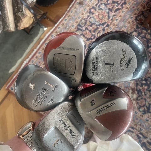 Stort set med blandade golfklubbor, både drivers, järnklubbor och putter. Skaft i både metall och grafit med olika loft och grepp.