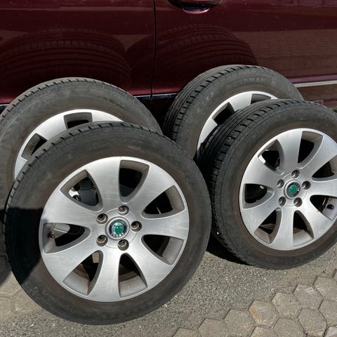 Oklart hur gamla däcken är., ca 5-6 mm mönsterdjup. Fälgarna är bra form förutom en repa och ett hack på en av dem, se bild.