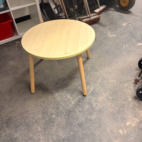 Barnbord från IKEA med rund vit skiva och två matchande pallar i trä. Benen skruvas enkelt fast under bordsskivan.