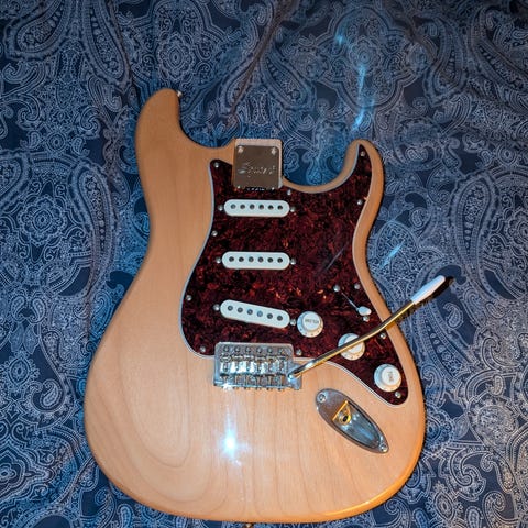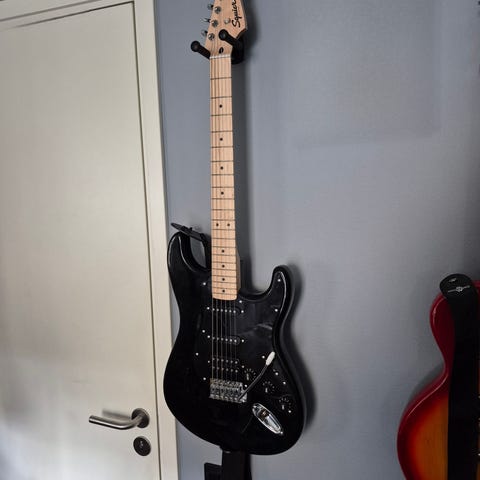 Säljer denna strata då jag köpt ny el-gura och har inte plats för flera gitarrer. Den spelar fint med kraftfull och skön ton. Fret-brädan är ”eboniserad” samt oljad och är snyggare än någonsin. Helt nya Ernie Ball 10-46 strängar på. På halsen är det vita märken från nybörjar-klisterlappar som va till för att lätt hitta vart fretten var. Dessa tog jag bort men träet runt omkring har fått mer färg. Det är sandpapprat så man känner ingen skillnad utan är endast visuellt.