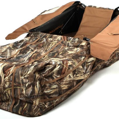 Kamouflagefärgad liggömsle med öppning framtill. Baksidan är svart med justerbara bärremmar och spänne så den är lätt att bära på ryggen.