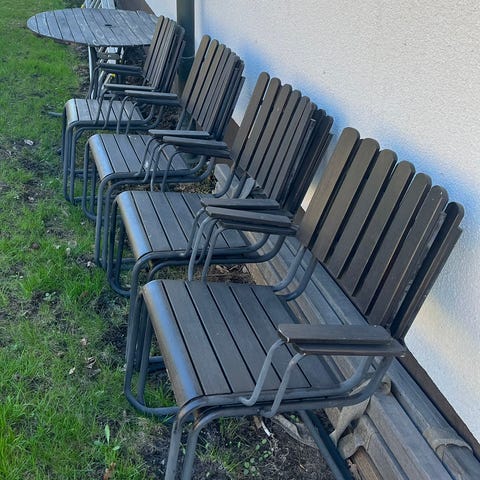 Utemöbler i gott skick säljes. Stolarna är inköpta på chilli och har använts ca. 3 säsonger och förvarats inomhus varje vinter. Svart ram i aluminium, armstöd i teak som med en lätt tvätt återfår sin forna glans och sits i glest vävt/perforerat material vilket är toppen för avrinningen efter lite regn. Det finns totalt 8 stolar. Säljer dessa för 100kr/styck.