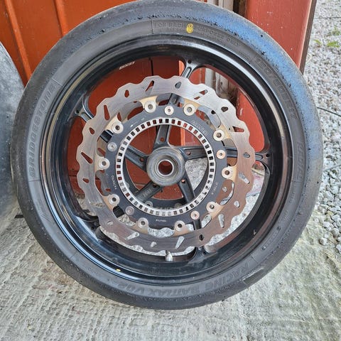 Två kompletta MC-fäljar med däck till Suzuki i storlek 100/90-16och 130/90-17. Guld-/silverfärgade fälgar med monterade bromsskivor och drev på bakhjulet,