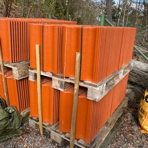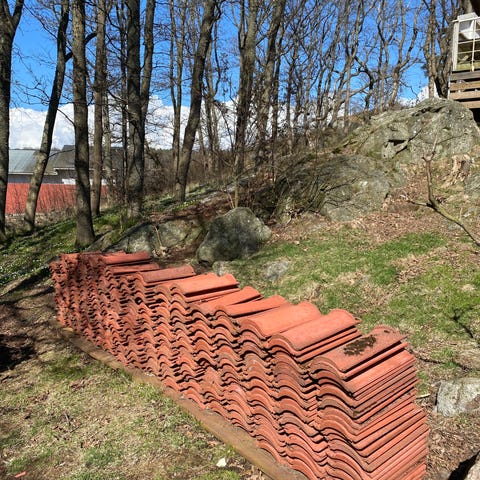 Finnes c:a 150 helt nya lertegelpannor från Vittinge, ofalsade, tvåkupiga som blivit över efter utbyte av pannor på vårt hus.