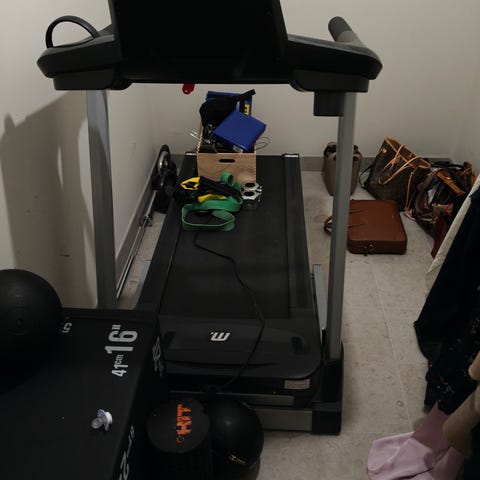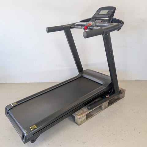 Master T25 löpband i svart/grått med tydlig display och flera knappar för hastighet och program. Har handtag fram, och kan fällas upp för att ta mindre plats.