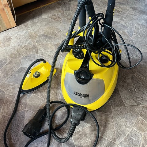 Kärcher handhållen ångtvätt med gul enhet och 3 munstycken.