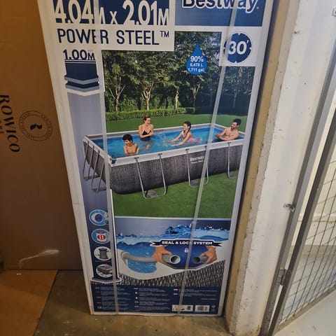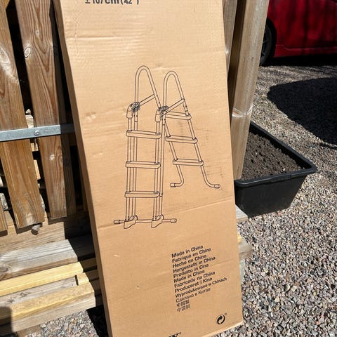 Poolstege från Avenli i originalkartong. Stabil stege med flera trappsteg och handtag upptill för enkel i- och urstigning ur poolen. För mått, se bild 2. Hämtas i Söndrum