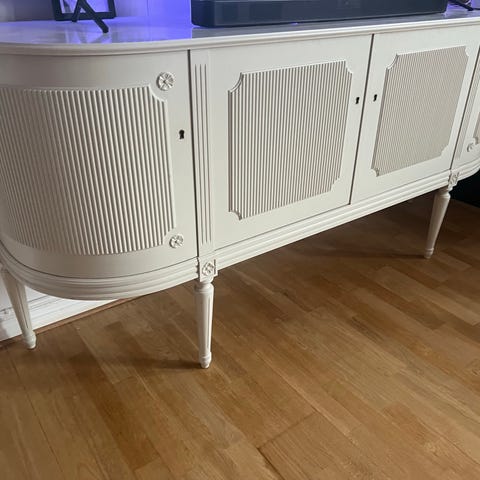 Säljer en mycket fin och stilren skänk/sideboard i klassisk design. Vitmålad med dekorativa räfflade fronter, rundade sidor och eleganta detaljer – passar perfekt i både vardagsrum, matsal eller hall.