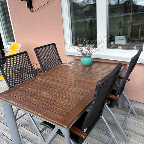 Matgrupp ute med bord och 4 stolar i konstrotting