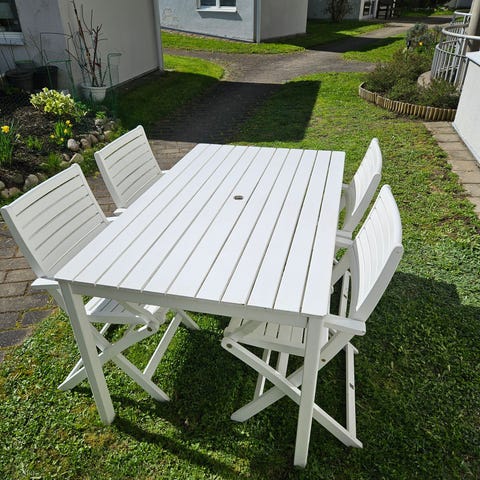 Vit trädgårdsbänk i trä med matchande bord, passar bra i trädgården eller på altanen. Bordet har plankskiva och bänken har ribbad rygg och sits.