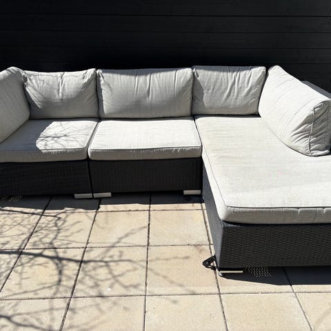 Hörnbalkongsoffa med dynor i svart tyg och vit stomme. Soffan består av flera moduler som kan ställas ihop till en hörnsoffa med schäslongdel. Passar för placering på balkong eller mindre uteplats. Sittdynor och ryggdynor ingår enligt bild.