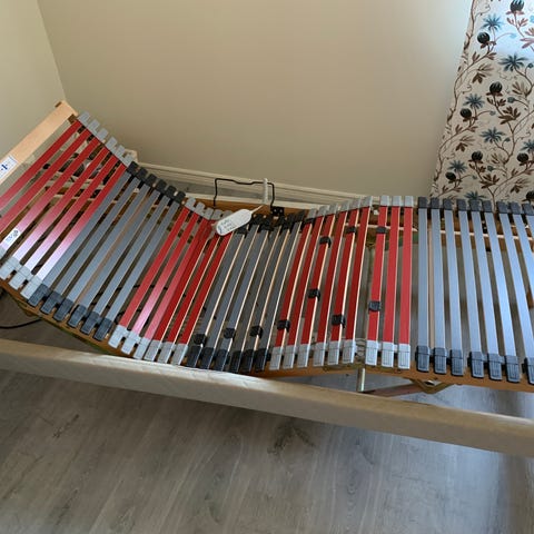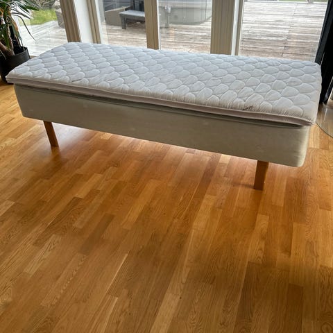 IKEA SNARUM sängbotten i ljusgrått tyg med vita ben. Stabil och enkel modell som står direkt på golvet med fyra ben.
