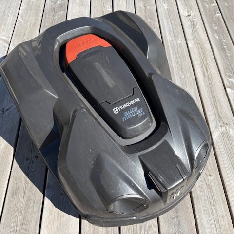Husqvarna Automower 308 robotgräsklippare med display som visar driftdata och enkel meny. Laddstation och ny nätadapter och ny kabel