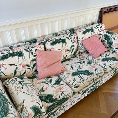 Passar lika fint som statement-möbel i vardagsrummet som i en lugn läshörna. Stilen påminner om Svenskt Tenn, men detta är alltså originaltextil från GP & J Baker.