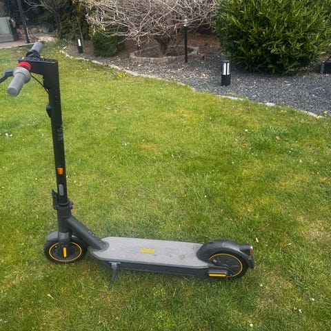 Ninebot elsparkcykel i svart med bred ståplatta och display vid styret. Har handbroms, ringklocka och rejäla däck fram och bak.
