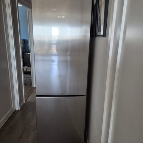 Candy kombiskåp med kyl och frys, rostfri front och två separata dörrar med handtag. Invändigt finns flera hyllor i kylen som går att konfigurera efter behov för bra indelning med grönsakslåda längst ner. Frysboxen innehåller en uttagbar gallerhylla. Bruksanvisning ingår.