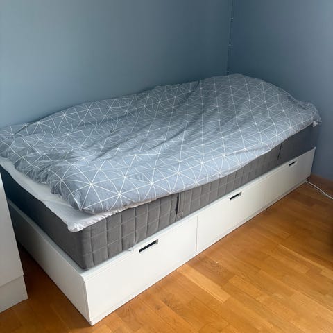 120 IKEA säng med madrass och resårbotten, mörk stomme och vit madrass. Sängen har 3st utdragslådor under för extra förvaring.