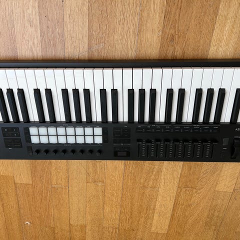Native Instruments Komplete Kontrol MIDI-keyboard med 25 tangenter säljes. Har rattar och knappar för styrning samt pitch- och modhjul på sidan.