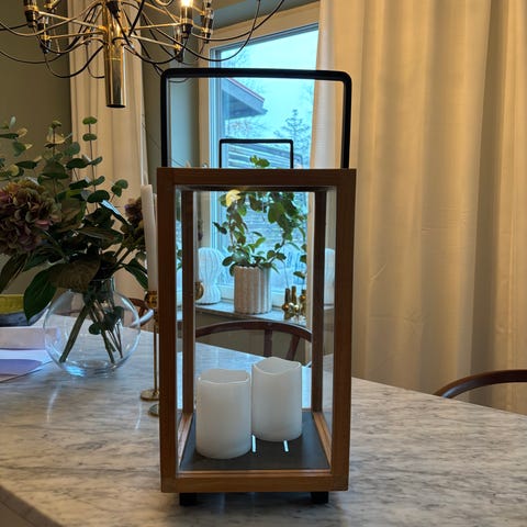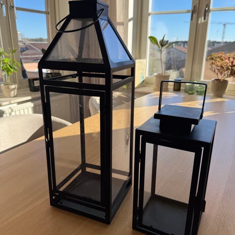 Lyktor från IKEA i metall och glas, fina att ha på altan eller balkong. Har handtag upptill och plats för större blockljus inuti.