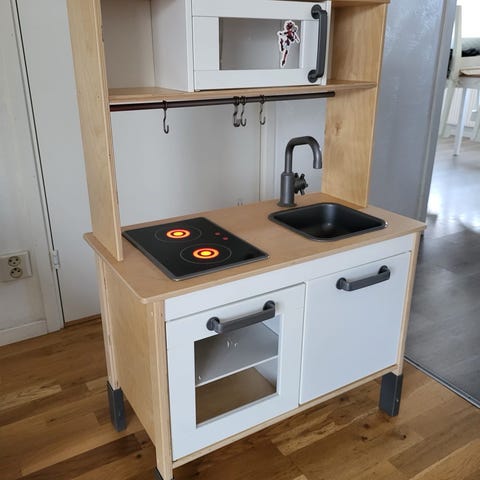 IKEA leksakskök med spisplattor, diskho och kran. Har förvaring under med lucka och öppet fack framtill.