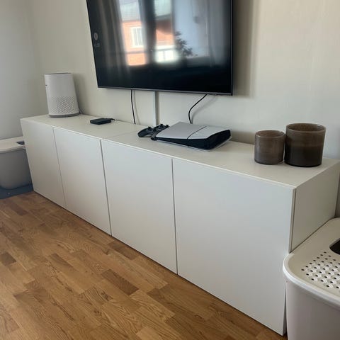 Säljer 3 sektioner IKEA Bestå golvskåp med dörrar Kallviken. Skåpen har tidigare suttit ihop därav hålen på insidan (se bilder). Säljer även Bestå hylla med Kallviken dörr. Finns ett större hål på hyllan då jag tidigare haft förstärkare där, så hyllan är perfekt för musikanläggning. Det förekommer lite slitage på samtliga delar (se bilder)