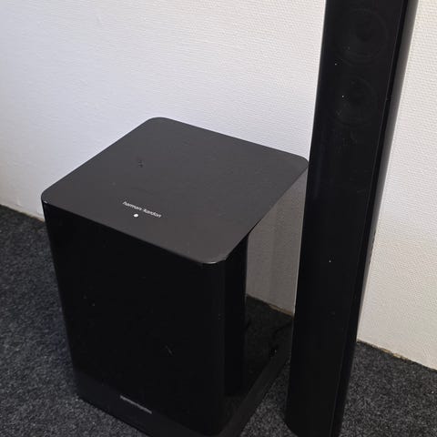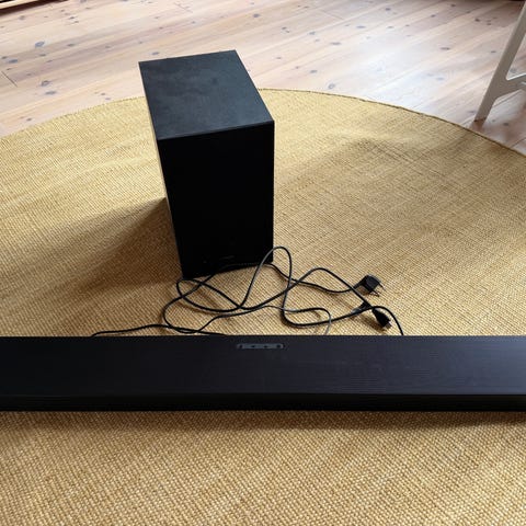 Samsung soundbar med trådlös subwoofer i svart. Ger bra ljud till tv:n och är enkel att ställa på tv-bänken.